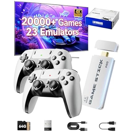 2026 New Retro Gaming Console, Retro Gaming Stick with 20,000+ Classic Games and 23 Game Emulators, Plug & Play 4K HDMI Output Game Console Stick with Dual 2.4G Controllers (64GB)
