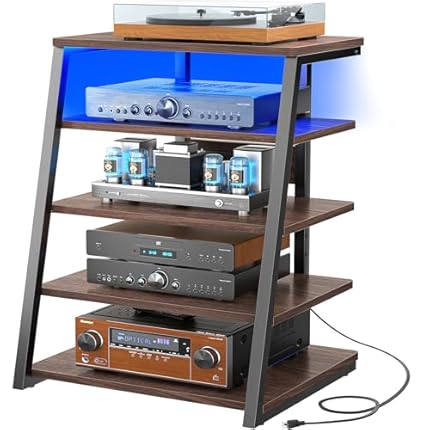 Armocity 5-Tier AV Media Stand with Power Strips, Media Console with LED Lights, Audio Tower Rack with Adjustable Shelves, Stereo Stands and Racks, 40.8”, Black Walnut