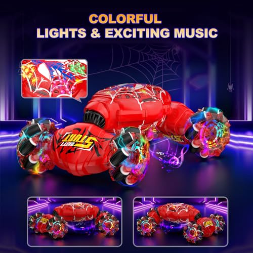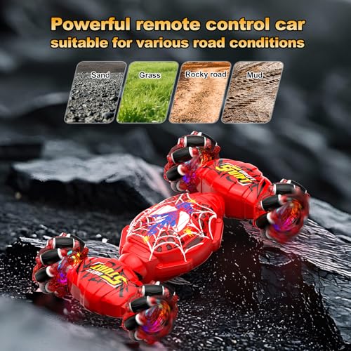 Cool Remote Control Car for Endless Fun: Introducing the newly upgraded 4WD RC stunt car, designed to unlock all-direction drifts, 360°double-sided rotations, and exciting snake-like twists—perfect for young adventurers craving action! Featuring a stunning Spider-themed design, this stunt car is equipped with dazzling LED lights and lively music that elevate the excitement, whether day or night. Ideal for both indoor and outdoor play, it’s an excellent option for boys and girls aged 8-12 who enjoy fast-paced RC fun!