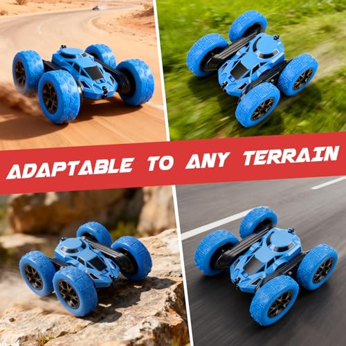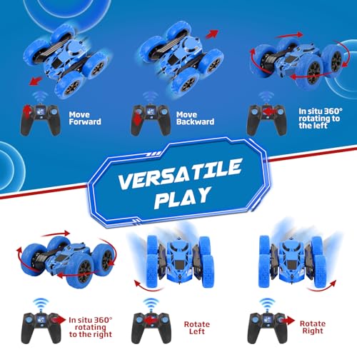 【360° Rotating & Double-Sided Remote Control Car】Best boys toys age 8-10. Made for little drivers, big thrills. Chunky tires grip carpet, grass, gravel, and kitchen tile while the crash-tested shell laughs off stairs and walls attacks. Simple two-button “Go” & “Spin” remote fits kids—no confusing menus, just instant wheelies, flips, and 360° spins.