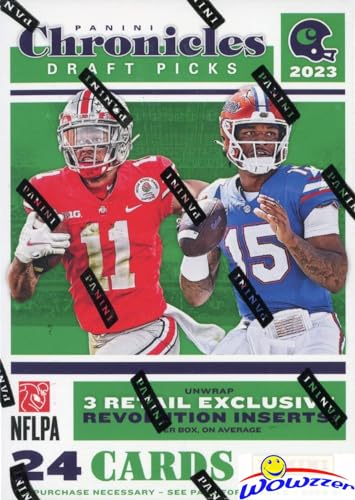 Panini presents the 2023 Draft Pick Chronicles Football Trading Card Blaster Box! Each box contains 6 packs with 4 cards per pack. Look for Retail Exclusive Revolution Inserts! Look for autographs from some of the top college draft picks! Collect them all!