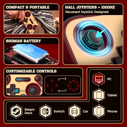 IINE Retro Pocket Game Controller, Wireless Gamepad for Switch/Steam Deck/PC/iOS/Android | Mini Portable Controller with Hall Joystick, 1000Hz Response Rate, Customizable Buttons, 600mAh Battery