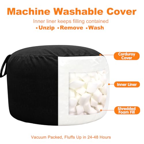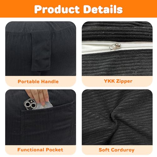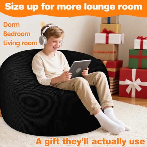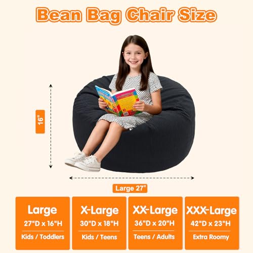 Corduroy Bean Bags with 4 Sizes for the Right Fit (Large to XXXL): Choose your best fit: Large 27″D x 16″H for kids and smaller spaces, XL 30″D x 18″H as a roomier all-around choice for older kids, XXL 36″D x 20″H for teens and many adults who want a true floor lounger feel, and XXXL 42″D x 23″H for adults who prefer an extra roomy sofa-style lounge; if you are between sizes or want more lounge room, it is best to size up