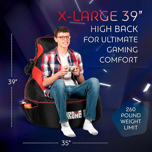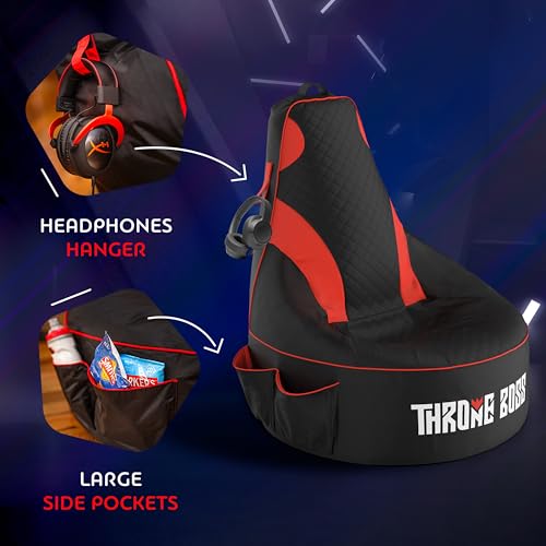 Throne Boss Gaming Bean Bag Chair Cover for Adults with High Back, Red – Large Floor Gaming Chair Cover, Easy to Clean Fabric, Large Pockets, Headphone Hanger, Requires 350 Liters Polystyrene Beans