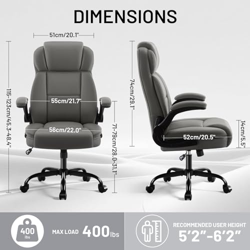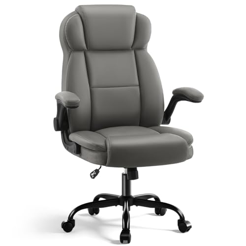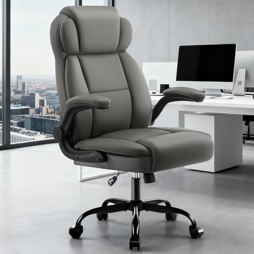 AreShark Ergonomic Office Chair with High Back Headrest, PU Leather Executive Desk Chair – Padded Flip-Up Armrests, Lumbar Support, Swivel Computer Chair for Home Office & Gaming, Gray