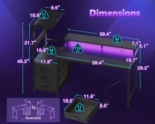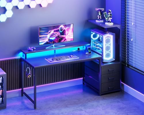 Casaottima 52 Inch Gaming Desk with USB Charging Ports & LED Light – Reversible Computer Desk with 3 Fabric Drawers, Monitor Stand, CPU Stand, and Side Hook, Modern Office Desk, Black
