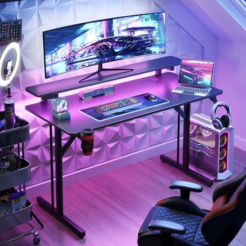 MOTPK 39 Inch Small Gaming Desk with LED Lights, Computer Desk Gaming Table with Monitor Shelf, Gamer Desk with Carbon Fiber Texture, Kids Boys Desk Gift for Men