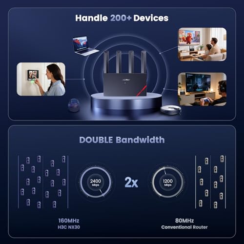 【Super-Fast Next-Gen WiFi 6】 Our WiFi 6 router experience the cutting-edge of ultra-wide 160MHz channel bandwidth, doubling the throughput of standard AX3000 routers. Enjoy combined speeds up to 3000Mbps (574Mbps on 2.4GHz + 2402Mbps on 5GHz) for seamless 4K streaming, lag-free gaming, and swift downloads. This powerful connection effortlessly handles multiple devices simultaneously, eliminating buffering and congestion for every smartphone, laptop, and smart home gadget in your household.
