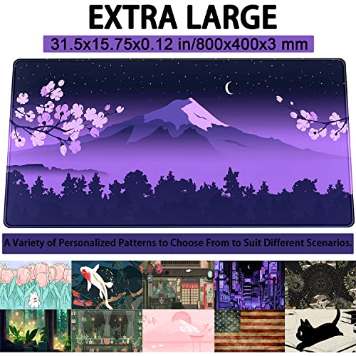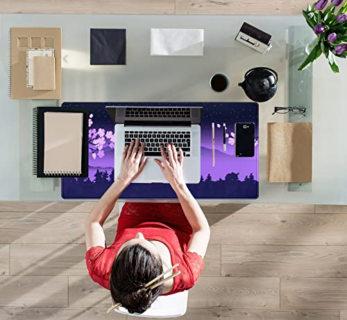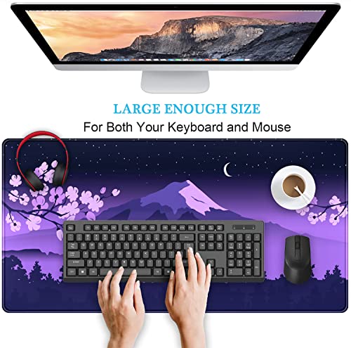 Purple Desk Mat Japanese Desk Pad Cute Fuji Mountain Gaming Mousepad Large, Cherry Blossom Mouse Pad XXL Desk Mats, Kawaii Anime Deskmats Desktop Protector Laptop Keyboard Mat Pad 31.5×15.75 in