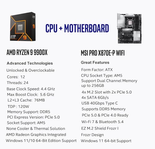 MICRO CENTER AMD Ryzen 9 9900X CPU Processor with MSI PRO X870E-P WiFi Motherboard (ATX, AM5, DDR5, PCIe 5.0 x16, M.2 Gen5, Wi-Fi 7)