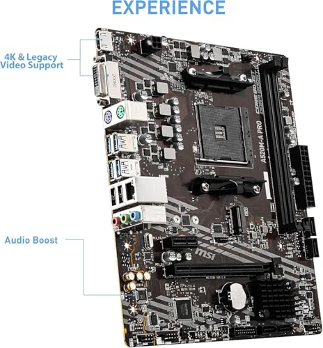 MSI A520M-A PRO Gaming Motherboard, Micro-ATX Form Factor, Supports DDR4 Memory, up to 4600(OC) MHz, AM4 Socket, 1x M.2 PCIe 3.0 slot (Key M), 4 x SATA 6Gb/s, AMD Turbo USB 3.2 GEN 1, Supports AMD Ryzen 5000 & 3000 & 4000 G-Series desktop processors