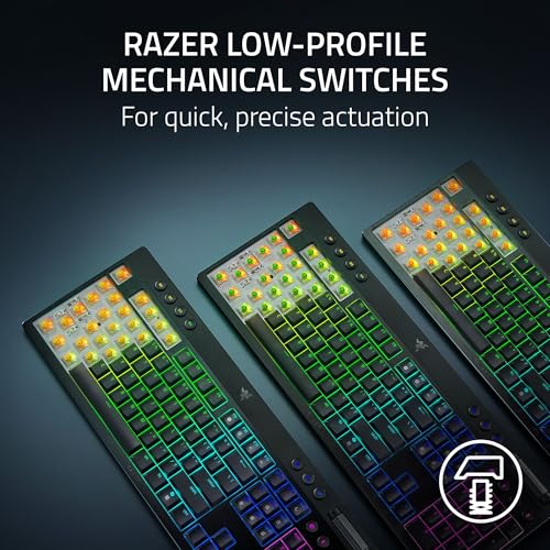 Achieve maximum battlestation impact while retaining a minimum silhouette. Meet the Razer BlackWidow V4 Low-profile HyperSpeed—a wireless, ultra-slim gaming keyboard that’s the full package. Choose between 3 low-profile switches that offer their own distinct feel. Go clicky with Green, get tactile with Orange, or keep it silent with Yellow. Game lag-free with our ultra-fast 2.4 GHz wireless and you can even pair a compatible Razer mouse to the same dongle via multi-device support. Attain higher levels of multi-tasking efficiency by toggling between 3 Bluetooth devices, and streamline your control with a clickable roller, dedicated media & connectivity buttons to manage music, devices and AI prompts, plus 4 specialized macro buttons to optimize gameplay. The ultra-low 18.5 mm front height provided an unparalleled strain-free typing and gaming experience for hours and hours and the keyboard is complete decked out with a solid aluminum ally top case for additional durability and a premium feel. Despite the low-profile nature, lubricated stabilizers in conjunction with dual-sound dampening foams offer clean keystrokes for an enhanced typing sound and feel. This is topped off with textured doubleshot PBT keycaps which are tougher and more durable than ABS, enabling it to maintain its pristine finish with optimized legends to promote greater backlight illumination no less. Finally, game up to 980 hours on a single charge with Power Saving Mode, easily accessible via a dedicated shortcut.