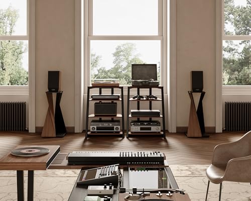 FITUEYES Design 4-Tier AV Media Stand Corner Shelf for Record Player Wooden Stereo Cabinet Audio Rack Tower with Height Adjustable Wooden Shelves for ps4 (Walnut)