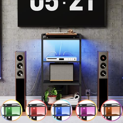 HOOBRO 4-Tier AV Media Stand with Charging Station and LED Light, Wooden Stereo Stand, Rack Audio Tower, Corner TV Stand, Entertainment Device, Black BB38UDCJ01
