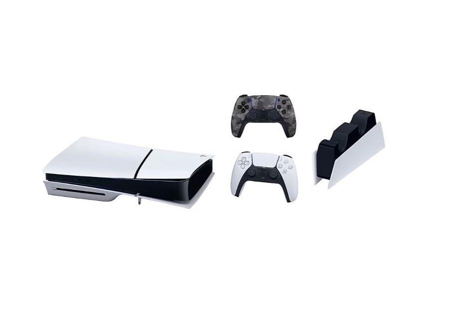 Sony PlayStation 5 Slim Disc Console Bundle with additional Gray Camo Controller and DualSense Charging Station